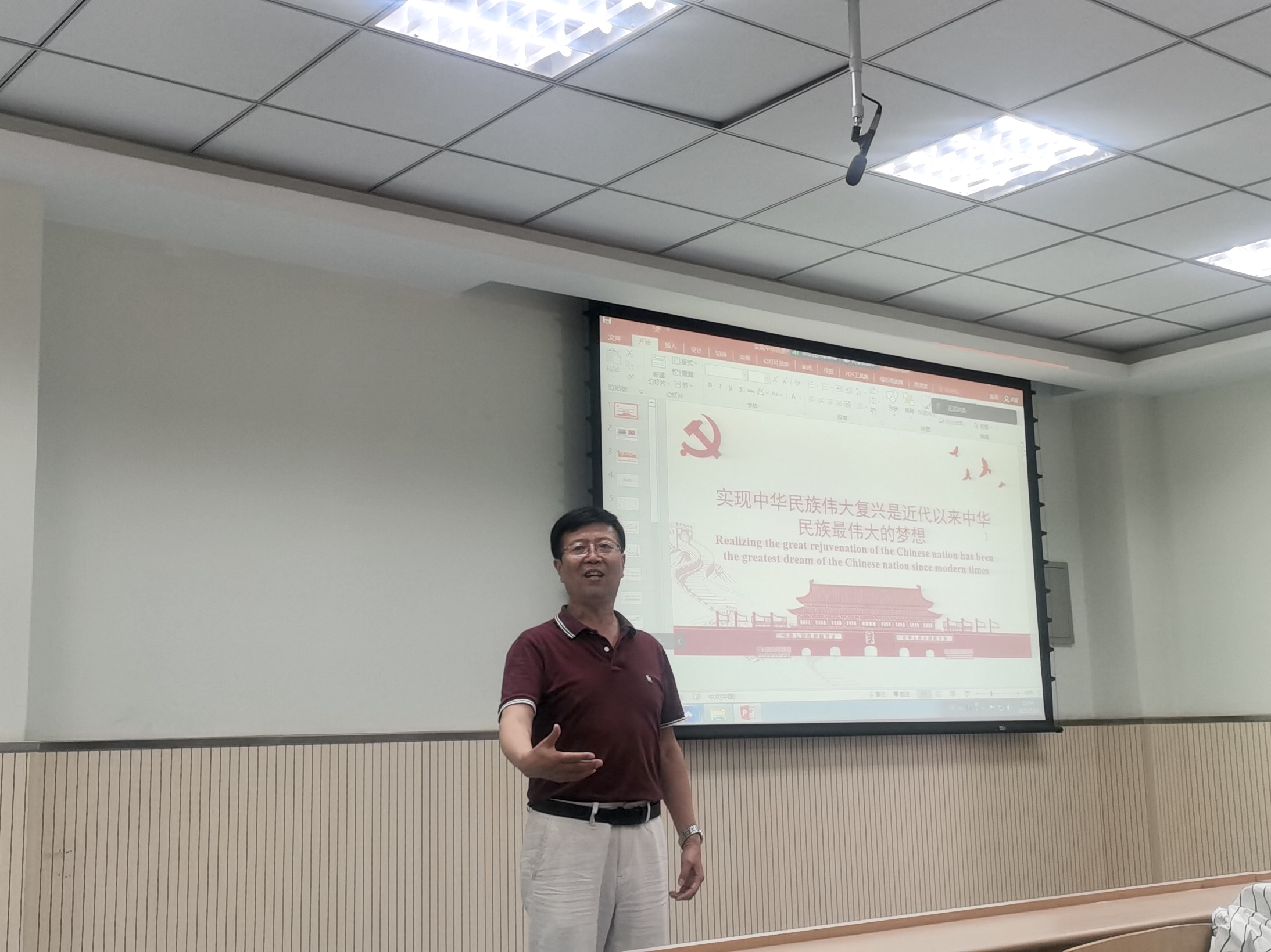 党课第四讲《实现中华民族伟大复兴是近代以来中华民族最伟大的梦想》(Realizing national rejuvenation has been the greatest dream of the Chinese nation since modern times),由退休党员教师王满良副教授主讲。他谈到,党的二十大报告指出当下中国共产党的中心任务就是团结带领全国各族人民全面建成社会主义现代化强国、实现第二个百年奋斗目标,以中国式现代化全面推进中华民族伟大复兴。他围绕中华民族伟大复兴的背景和意义、实现路径、党员责任与使命以及党课的总结与展望等四个部分进行讲解。他希望新时代青年党员,要不断增强做中国人的志气、骨气、底气,培养家国情怀,树立担当意识,发扬实干精神,赓续共产党人的精神血脉,坚定理想信念,站稳人民立场,为实现中华民族伟大复兴贡献智慧和力量。