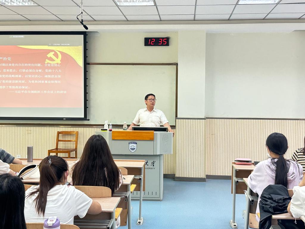 第一讲《全面从严治党》(Exercising full and rigorous self-governance of the Party),由学院党委书记单升军主讲,他以习近平总书记关于党的建设的重要思想为统领,从“为什么要全面从严治党”“什么是全面从严治党”“新时代全面从严治党有哪些要求和经验”“新征程上如何一刻不停地推进全面从严治党”等四个方面进行解读。他谈到,党中央作出全面从严治党的战略部署,以坚定决心、顽强意志加以推进,团结带领全党开创了党的建设新局面,为党和国家事业取得历史性成就提供了坚强政治保证。他提到,全面从严治党核心是加强党的领导,基础在全面,管全党、治全党,面向全体党员和党组织;关键在严,真管真严、敢管敢严、长管长严;要害在治,各级党组织都要肩负主体责任,各级纪委要担负起监督责任。他表示,新征程上就是要落实新时代党的建设总要求,健全全面从严治党体系,全面推进党的自我净化、自我完善、自我革新、自我提高,使我们党坚守初心使命,始终成为中国特色社会主义事业的坚强领导核心。最后,他寄语广大学生党员“青年当有志,立志在四方;祖国需要处,皆是我故乡”。