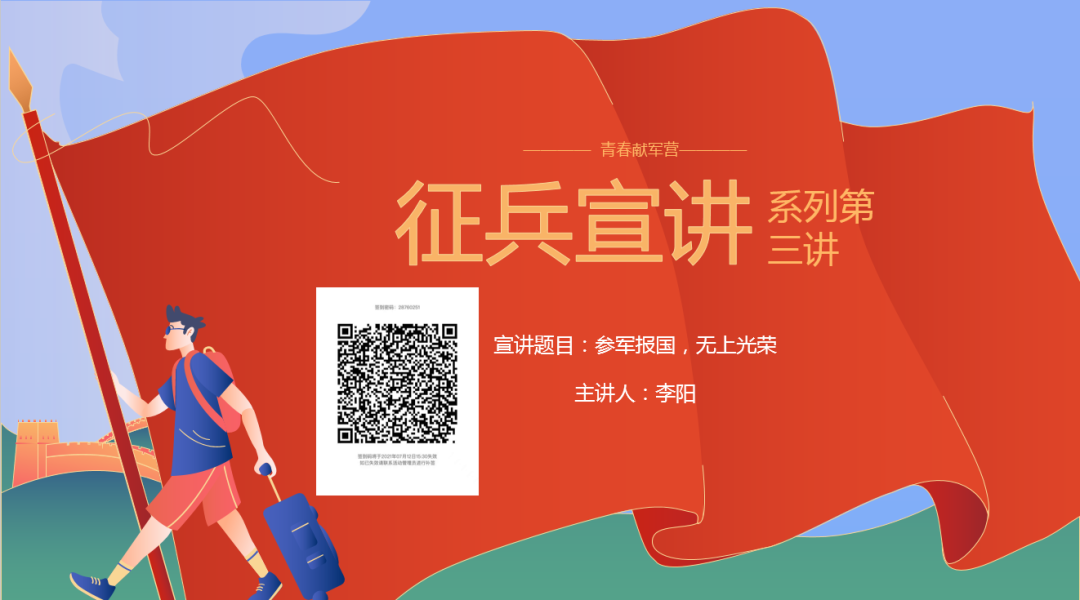 按照学校征兵工作安排部署,必赢官网高度重视2021年下半年征兵工作,结合教学育人实际,把征兵宣讲作为学生实践周军事理论教育的一部分落到实处。7月12日,系列征兵宣讲的第三场活动通过线上方式顺利进行,本次宣讲“参军报国,无上光荣”为主题,主讲人是我校征兵宣讲团成员、优秀退伍大学生李阳,必赢官网辅导员张君尧组织2019级和2020级近300名学生参加了宣讲会。