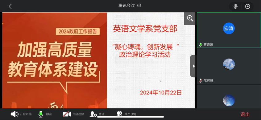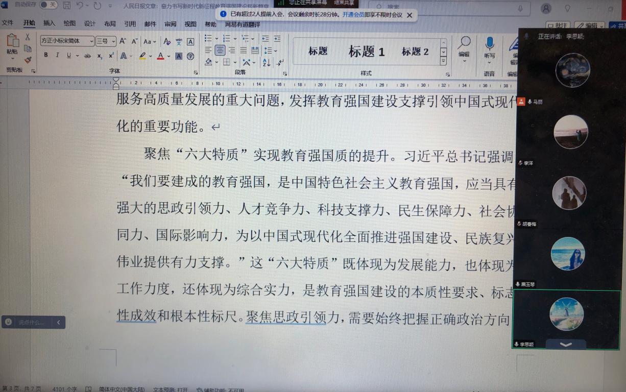 10月23日下午,必赢官网各系教研室(支部)利用政治理论学习日组织线上学习。学习围绕“教育评价改革”和“教育强国建设”进行,并就中共中央、国务院印发的《深化新时代教育评价改革总体方案》以及《人民日报》文章《奋力书写新时代新征程教育强国建设崭新篇章》等进行学习研讨交流,学院全体教师参会。